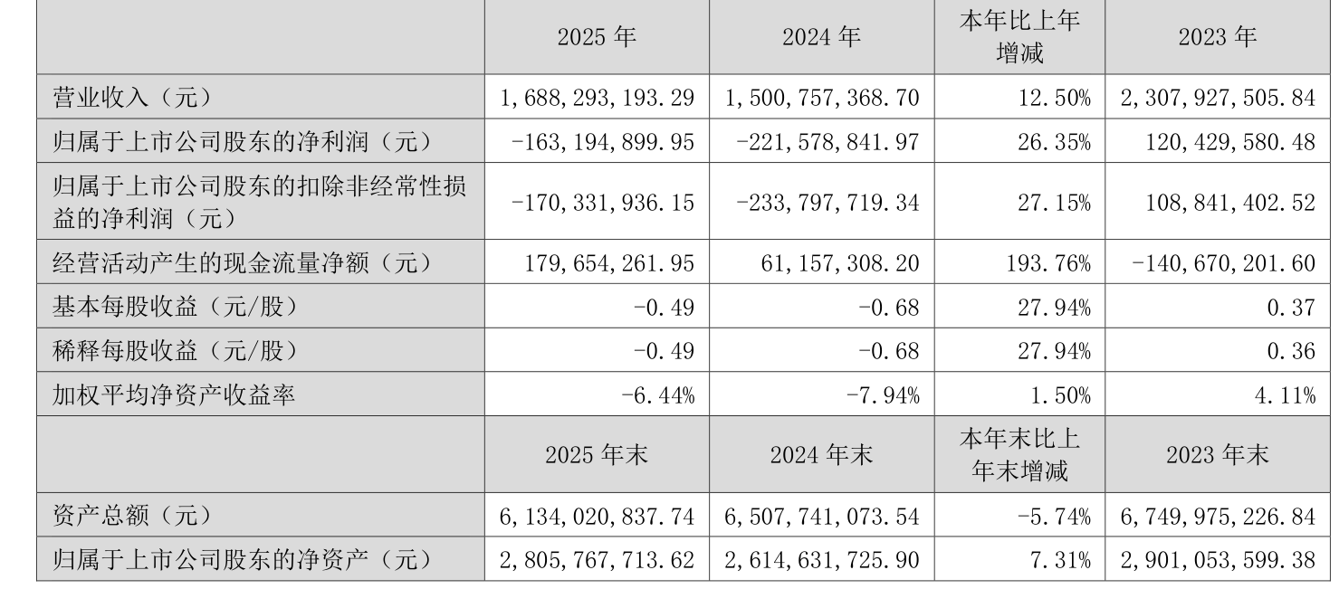 中证智能财讯设研院(300732)4月16日披露2025年年度报告。2025年,公司实现营业总收入16.88亿元,同比增长12.50%;归母净利润亏损1.63亿元,上年同期亏损2.22亿元;扣非净利润亏损1.7亿元,上年同期亏损2.34亿元;经营活动产生的现金流量净额为1.8亿元,同比增长193.76%;报告期内,设研院基本每股收益为-0.49元,加权平均净资产收益率为-6.44%。