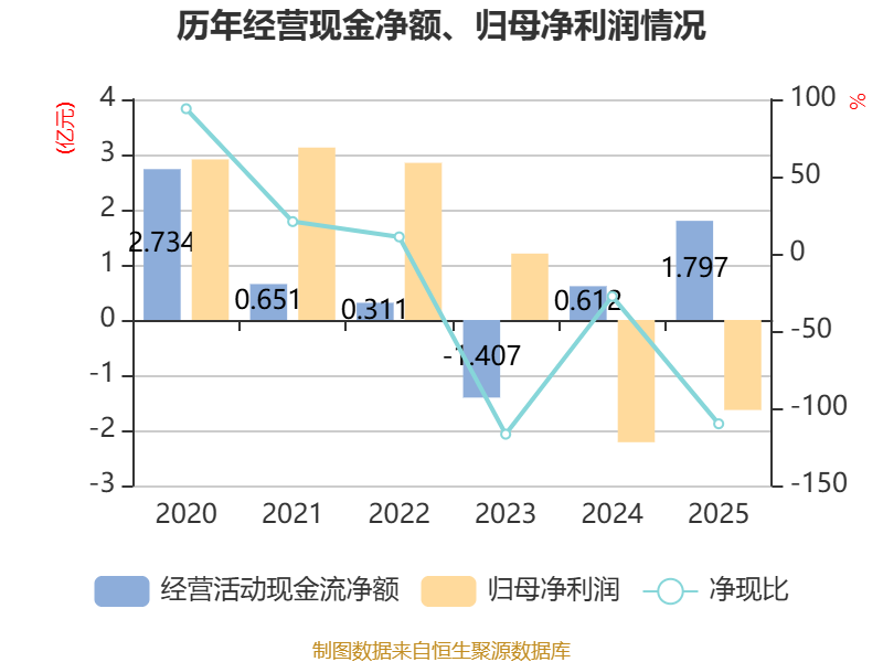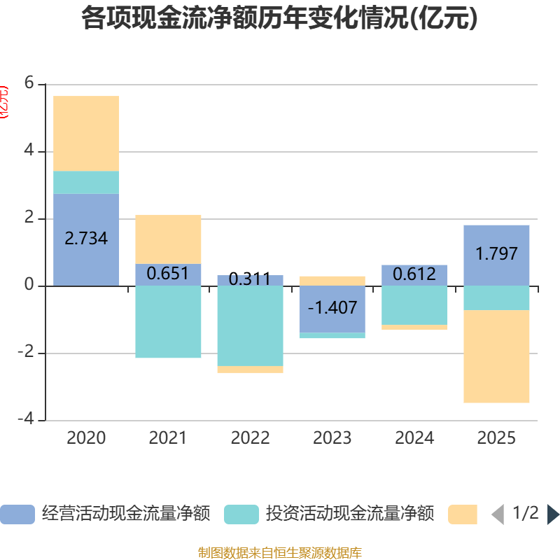 截至2025年,公司经营活动现金流净额为1.8亿元,同比增长193.76%;筹资活动现金流净额-2.76亿元,同比减少2.61亿元;投资活动现金流净额-7331.87万元,上年同期为-1.17亿元。